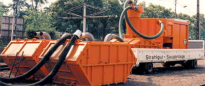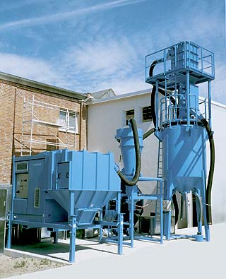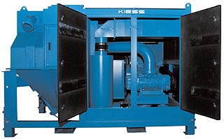 Sollte es sich bei dem Sauggut um wiederverwendbares Strahlmittel handeln, so kann dieses in einem speziellen KIESS-Vakuumstrahlmittelreiniger, welcher auf dem Silo angeordnet wird, effizient von Grobteilen und Staub getrennt und dem Strahlprozess erneut zugeführt werden. Im mechanischen Vorabscheider der Sauganlage findet die Grobstaubabscheidung statt. Eine zuverlässige Filteranlage besorgt die Abscheidung der Feinstäube. Der Staub fällt in den Staubbunker und kann nach Öffnen einer Handabsperrklappe abgesackt oder auf Wunsch über eine Staubaustragsschnecke entsorgt werden.
